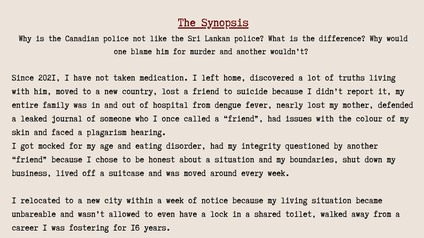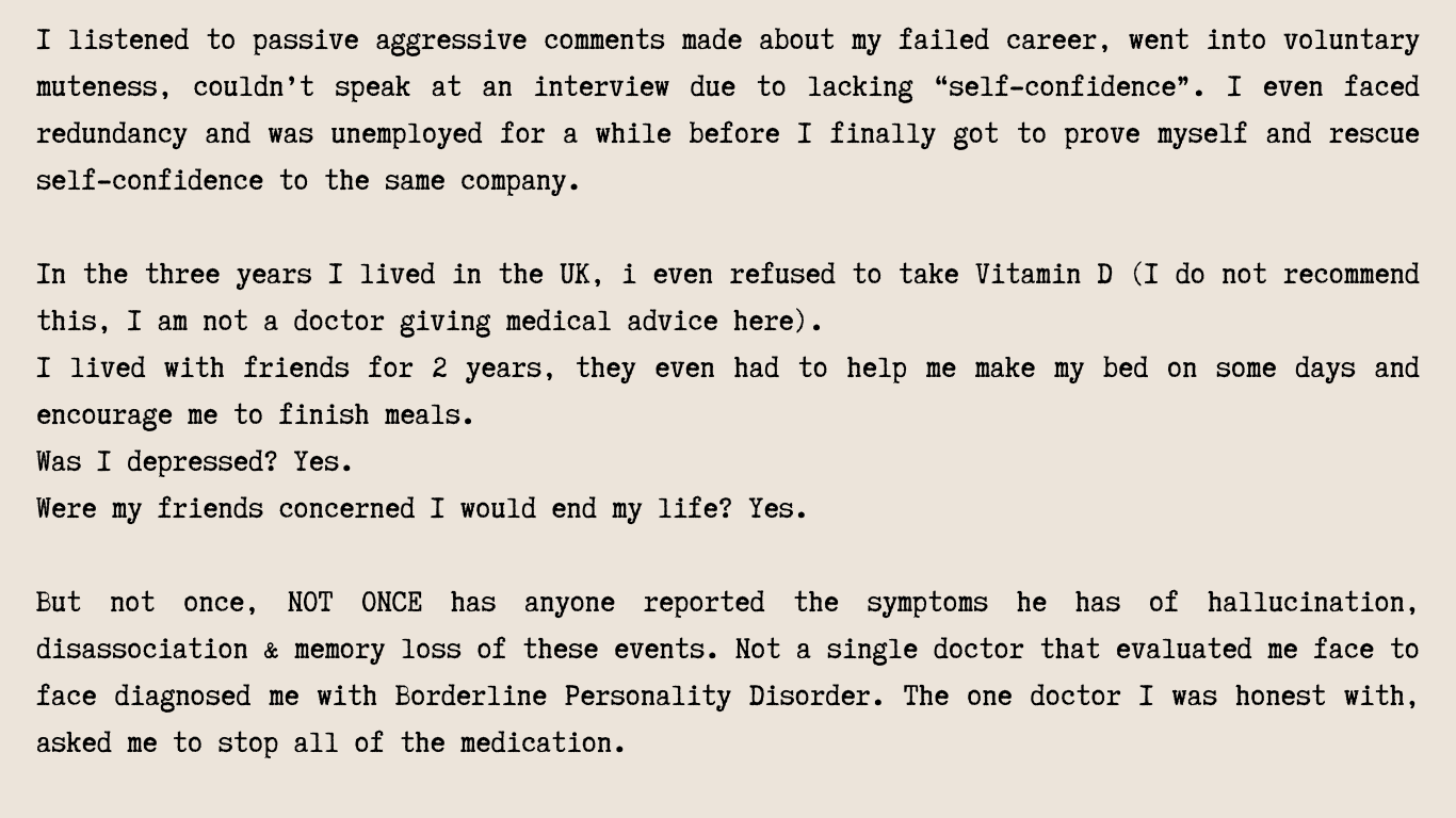 In my case, I couldn’t even be completely honest with my doctors. I wasn’t allowed to speak to priests; I had to justify it by saying I was speaking in confession. I am still in the process of rehabilitating my mind. That doesn’t mean you should look at my story timeline loop and think to yourself, ‘Oh, it’s not that bad for me. I am lucky.’